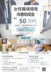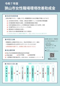 公開日:2025年06月13日 お知らせ 令和7年度狭山市女性職場環境改善助成金のご案内狭山市では、女性が活躍しやすい職場環境の整備等に取り組む市内事業所に対し、整備等にかかった経費の一部を助成します。詳しくは狭山市役所HPをご確認ください。